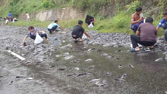 Sementara pantauan di lapangan, warga langsung berebutan lele yang terlanjur tumpah dari truk, tanpa menghiraukan jalan yang licin.