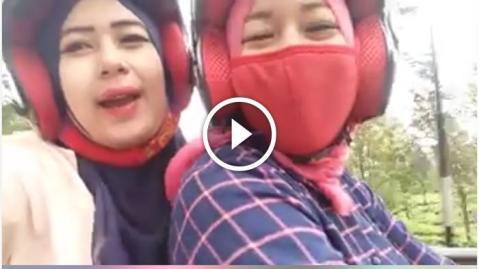 Video ini berisi seorang wanita yang merekam dirinya sendiri. Wanita mengenakan jilbab ini berada di atas motor.