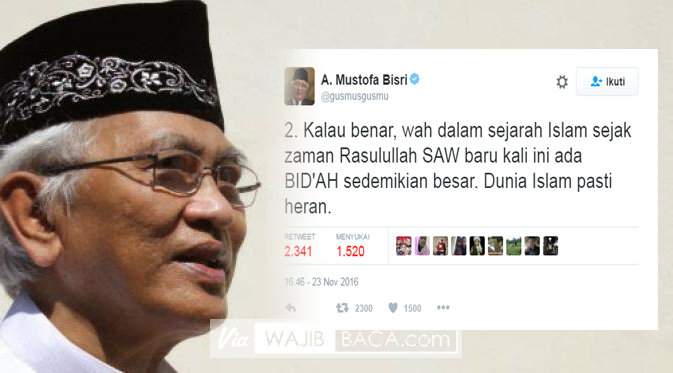 2. Kalau benar, wah dalam sejarah Islam sejak zaman Rasulullah SAW baru kali ini ada BID'AH sedemikian besar. Dunia Islam pasti heran.— A. Mustofa Bisri (@gusmusgusmu) 23 November 2016