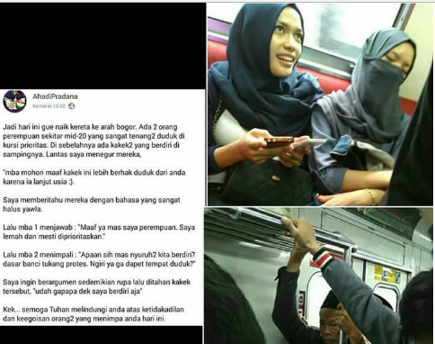 Seperti yang terlihat pada foto terlihat akun facebook dengan nama AhadiPradana menceritakan pengalamannya ketika menjumpai 2 orang wanita berhijab yang duduk di kursi prioritas bagi lansia dan ibu hamil, padahal terlihat jelas ada kakek-kakek yang berdiri disampingnya.