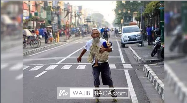 Dalam foto yang beredar di lini masa tersebut menunjukkan sosok seorang pria tua tengah sibuk memomong cucunya di kawasan Malioboro, Jogjakarta.