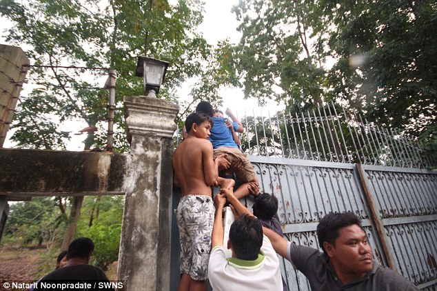 Tharathep Wanacharoenlap sedang dibantu untuk melepaskan lehernya dari pagar