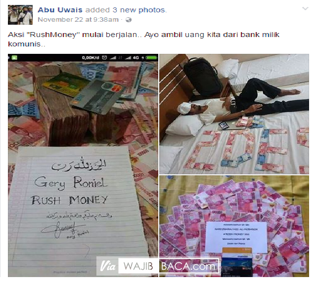 Ia ditangkap lantaran mengunggah foto diri dengan sejumlah uang pada akun Facebook miliknya dan disertakan tulisan "Aksi rush money mulai berjalan ayo ambil uang kita dari bank Milik Komunis".