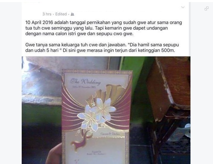 Sayang seribu sayang, untung tak dapat diraih malang tak dapat ditolak. Keadaan berupa begitu cepat, baru seminggu membicarakan tanggal pernikahan bersama calon mertua, pria ini mengaku shock lantaran mendapatkan undangan pernikahan dengan nama calon istrinya yang bakal menikah dengan sepupunya sendiri.