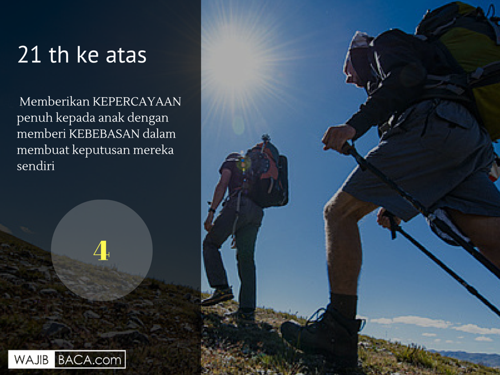 Fase ini adalah masa ibu dan ayah untuk memberikan penuh kepercayaan kepada anak-anak dengan memberi kebebasan dalam membuat keputusan mereka sendiri. Orang tua hanya perlu memantau, menasehati dengan diiringi doa agar setiap tindakan yang diambil mereka adalah betul. Berawal dari pengembaraan kehidupan mereka yang benar di luar rumah. Dengan segala displin yang diasah sejak tahap ke-2 sebelum ini cukup menjadi benteng diri buat mereka. Orang tua jangan pernah lelah untuk menasehati mereka, karena kalimat nasehat yang diucapkan sebanyak 200 kali atau lebih terhadap anak-anak mampu membentuk tingkah aku yang baik seperti yang orang tua inginkan.