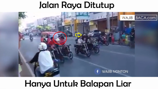 Penulis Unknown | Ditayangkan 17 Nov 2016Sangat menyebalkan apabila tahu ada para pembalap liar yang menggunakan jalan utama sebagai adu ketangkasan. Bukan hany pada malam hari saja hal tersebut bisa terjadi, namun pada siang hari ketika ramai orang berlalu lalang juga kerap diadakan hal serupa tanpa memikirkan keselamatan orang lain.