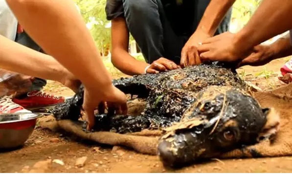 Dengan kerja keras dan dedikasi, setelah menggosok anjing itu dengna minyak sayur selama tiga jam, tar yang menutupi tubuhnya dibersihkan. Semua orang bahagia melihat anak anjing yang terlihat senang diselamatkan dari tumpukan tar.
