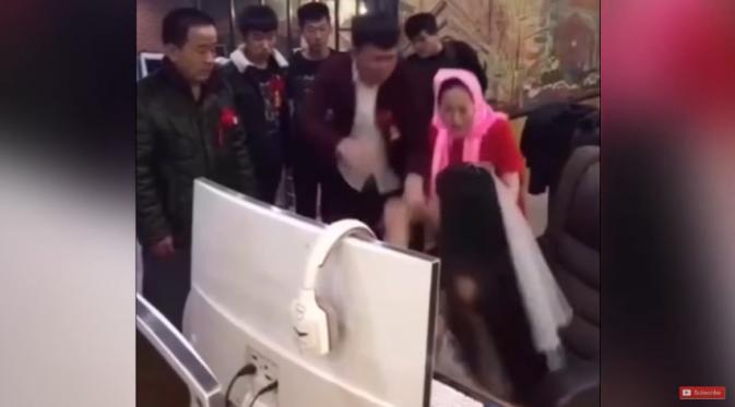 Mempelai pria kemudian berteriak "Tolonglah, istriku, aku mohon, ikutlah denganku," setelah ia dan kedua temannya menyeret mempelai wanita dari kursinya dan menjauhkannya dari komputer. Namun, video yang viral di Tiongkok ini diragukan keasliannya. Ada netizen yang berkata bahwa video ini hanya dibuat-buat.