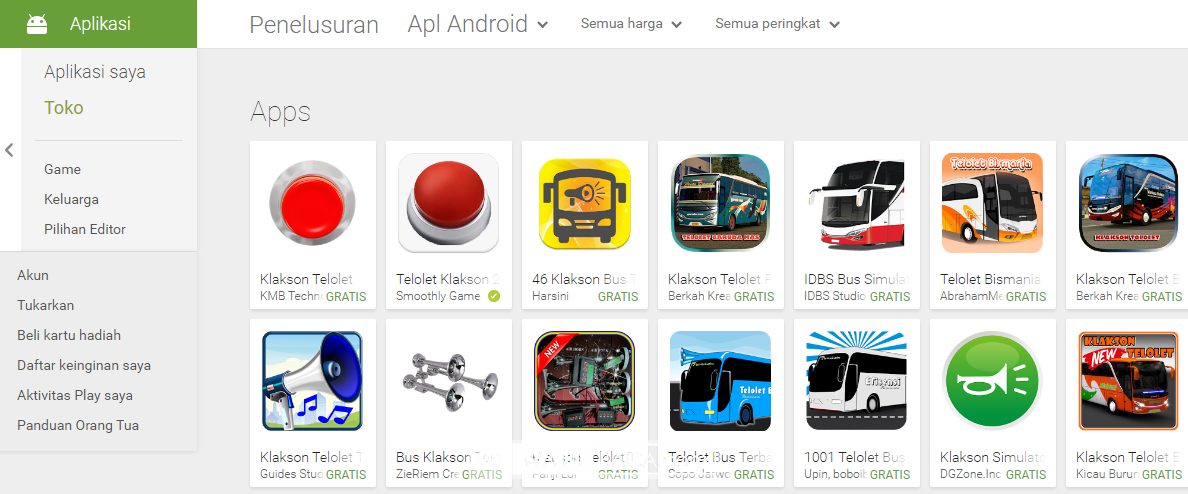Sebagian aplikasi terlihat berhasil mengumpulkan angka download yang relatif banyak. Aplikasi berjudul Klakson Telolet (Big Bus Horn) yang terakhir diperbarui pada akhir Juli lalu, misalnya, memilki angka unduhan lebih dari 500.000.