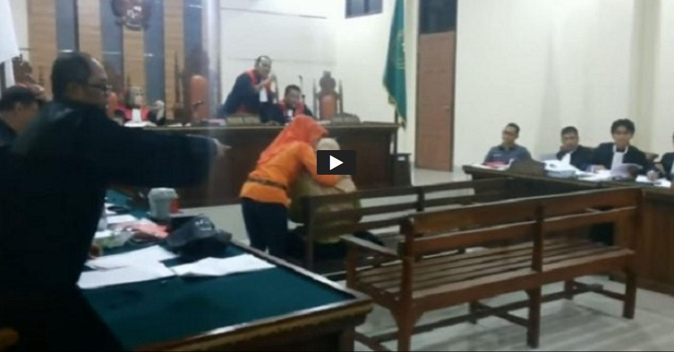 Seorang kerabat berusaha menenangkan Umi. Tak terkecuali Minanoer Rachman, hakim ketua yang bicara dari kursinya.