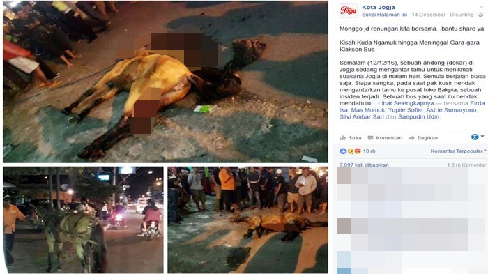 Kisah pilu itu dikisahkan di sebuah grup Facebook, Kota Jogja yang kami kutip dari Tribun. Terdapat sebuah tulisan yang dibuat oleh Riana Dewie yang sebelumnya sudah tayang di Kompasiana.com dengan judul: Kisah Kuda Ngamuk hingga Meninggal Gara-gara Klakson Bus.