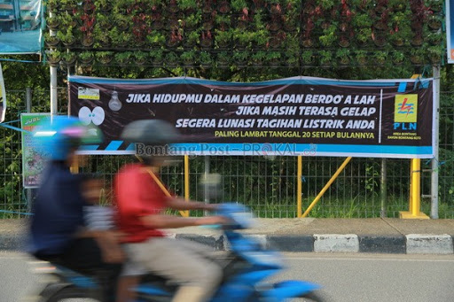 “Jika hidupmu dalam kegelapan berdoalah. Jika masih terasa gelap segera lunasi tagihan listrik Anda,” demikian kalimat yang tertulis di spanduk yang dipasang di Jalan Bhayangkara, Bontang, dikutip dari bontangpost.