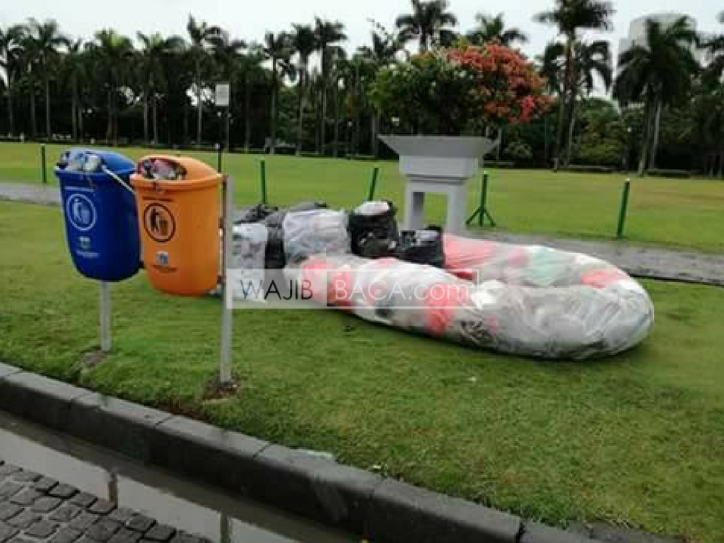 Usai shalat Jumat dan area lapangan Monas berangsur sepi. Tiga truk pengangkut sampah pengelola Monas terlihat mengangkut kantung-kantung sampah yang dikumpulkan relawan kebersihan dan peserta aksi.