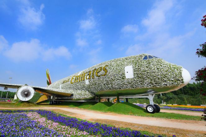 Dalam pembuatannya, replika Emirates tersebut dikerjakan oleh 200 orang. Mereka menghabiskan waktu 10 jam setiap harinya selama enam bulan. Untuk logo Emirates saja, lebih dari 9.000 bunga yang digunakan dan lebar sayap yang mencapai 79 meter diselimuti oleh 100.000 bunga. Rencananya taman bunga unik ini akan dibuka hingga Mei 2017.