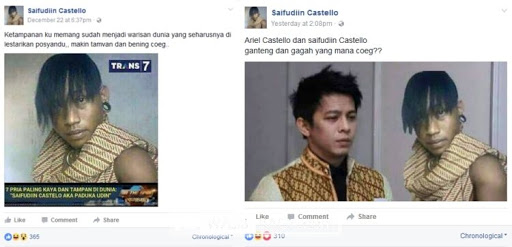 Kali ini beredar foto seorang pria dengan gaya nyentrik. Pria dengan nama akun Facebook Saifudiin Castello membuat heboh netizen dengan foto selfie-nya. Hal yang menjadi fokus netizen adalah caption foto dirinya yang terkesan menyombongkan diri dan dianggap tak rasional.