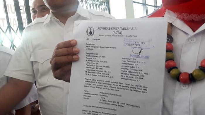 Berkas gugatan perdata yang dilayangkan pihak Novel Bamukmin bersama Advokat Cinta Tanah Air (ACTA) kepada pihak tergugat yakni Gubernur DKI Jakarta non aktif, Basuki Thajaja Purnama (Ahok).