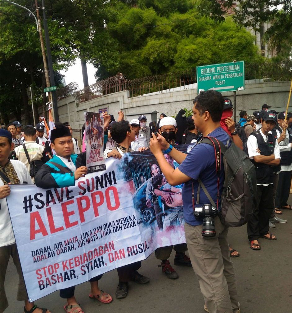 Ratusan massa aksi solidaritas ini berasal dari berbagai elemen. Mereka tumpah ruah di depan kantor kedutaan besar Rusia guna mengutuk keterlibatan mereka dalam operasi militer di Suriah, Aleppo.