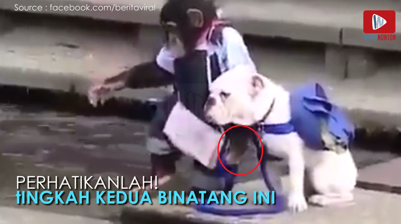 Apalagi saat si monyet yang dengan gemas menyeret si anjing untuk melompat, namun anjing tersebut terlalu takut untuk menyeberang.