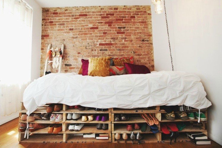 5. Kolong tempat tidur yang ditinggikan dengan palet kayu ini bisa kamu gunakan untuk menyimpan koleksi sepatu. Lumayan, nggak perlu banyak rak untuk menyimpan sepatu-sepatumu