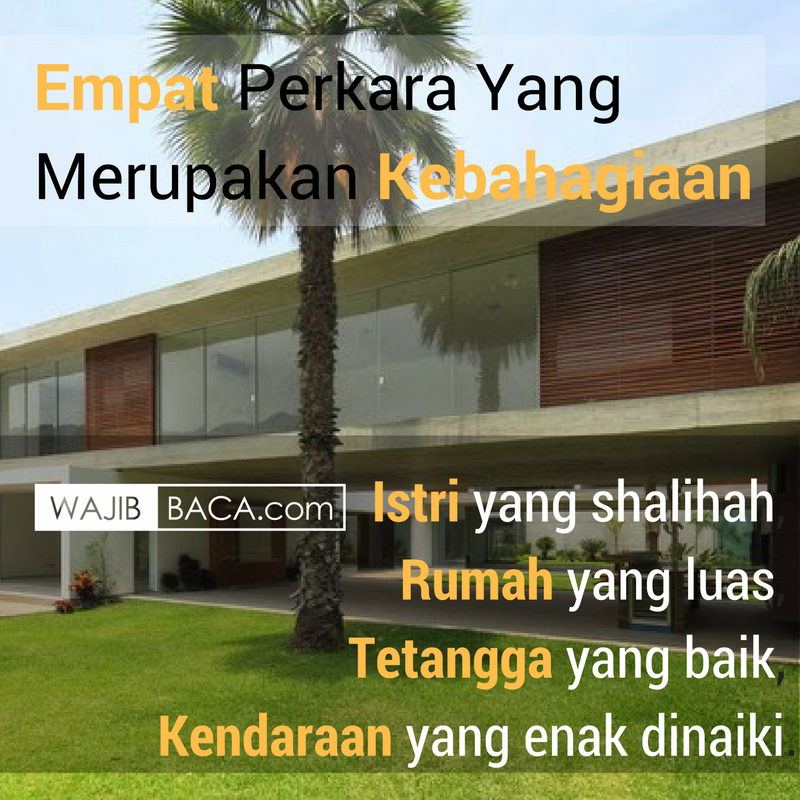 "Empat perkara yang merupakan kebahagiaan, yaitu istri yang shalihah, rumah yang luas, tetangga yang baik, dan kendaraan yang enak dinaiki. Dan empat perkara yang merupakan kesengsaraan adalah tetangga yang jelek, istri yang buruk akhlaknya, rumah yang sempit, dan kendaraan yang tidak enak dinaiki," (HR Ath-Thabrani dan Imam Ahmad).