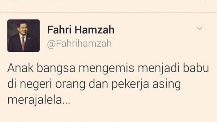 Wakil Ketua DPR RI Fahri Hamzah dikecam oleh sejumlah pengguna media sosial karena cuitannya di Twitter yang menyebut bahwa warga Indonesia 'mengemis menjadi babu di negeri orang'.