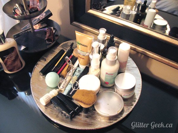 5. Sering dandan di kamar mandi? Letakkan saja peralatan make-up di atas wadah yang umumnya digunakan buat menaruh kue-kue di pesta mewah