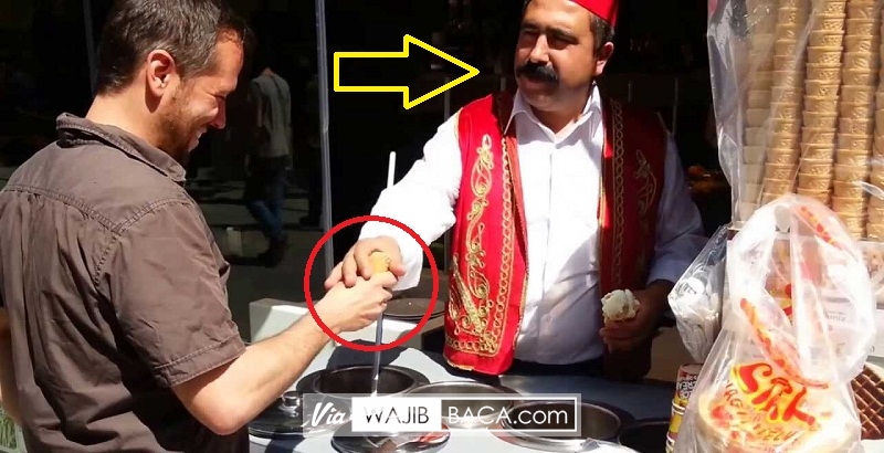 Atraksi dengan kecepatan tangan dan menggunakan cone ice cream yang diputar-putar mungkin cukup membuat pembeli kesal. Apalagi saat es krim yang sudah berada di tangan ternyata tidak jadi diapatkan. Meskipun begitu cara ini cukup jitu untuk menarik perhatian pembeli karena kelucuannya. Penasaran seperti apa? Simak videonya berikut ini.