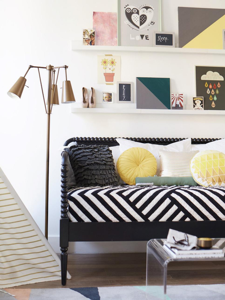Ingin memberikan aksen agar ruangan kecil lebih hidup? Pilih satu motif sebagai fokus di ruangan tersebut, misalnya menggunakan kain penutup sofa yang memiliki motif garis yang tebal.