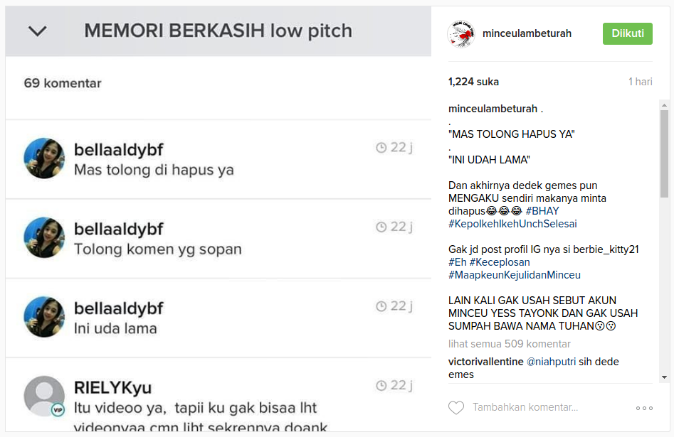 Kemudian akun @lambe_turah memposting kembali screen shoot permintaan akun bellaaldybf untuk menghapus video smule tersebut.