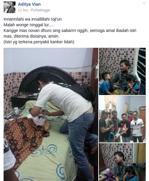 Namun hari ini akun facebook Aditya Vian memposting bahwa istri akun Novan Dhuro telah meninggal dunia.