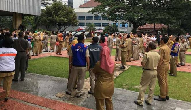 Ratusan Pegawai Negeri Sipil Pemerintah Provinsi DKI Jakarta berhamburan keluar dari Gedung Blok G Balai Kota, Jakarta Pusat.