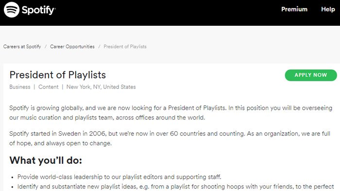 Daniel Ek menawarkan pekerjaan sebagai President of Playlists kepada Obama. Adapun posisi jabatan yang ditawarkan oleh Daniel Ek pada Obama ini bermukim di New York. Dilihat dari detail deskripsi pekerjaan, tampaknya Obama akan sangat cocok dengan posisi ini.