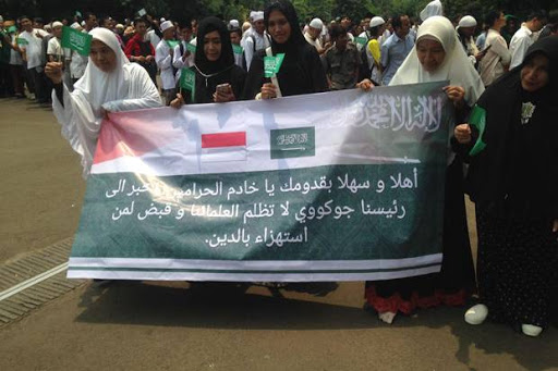 Setelah beberapa saat, seorang awak media yang bisa berbahasa Arab menerjemahkan makna dari spanduk tersebut. "Selamat datang Raja Salman, kami ingin beritahu anda untuk melarang presiden kami Jokowi menzalimi ulama kami dan tangkap segera penista agama" kata salah seorang awak media yang berhasil menerjemahkan spanduk tersebut.