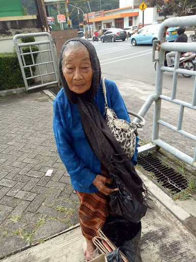 Nenek berusia 88 tahun itu hanya memakai sendal jepit, kain batik sebagai bawahan, kebaya biru kebesaran, dan kerudung hitam.