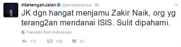 Ernest Prakasa dalam twitternya, dengan tanpa basa-basi, melemparkan pernyataan bahwa Zakir Naik mendanai ISIS, dan menyesalkan Wakil Presiden, Bapak Jusuf Kalla, menjamu Zakir Naik, padahal yayasannya sudah di-banned di India dan UK.