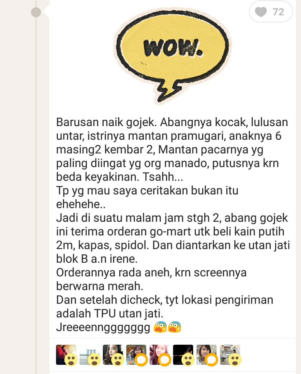 Sebelumnya ada kisah mengenai penumpang ojek online yang buang air di atas motor, ada juga penumpang yang dikira hantu orek pengemudi ojek gara-gara mengenakan rok.
