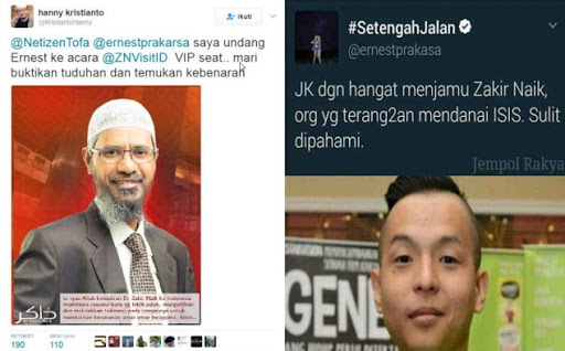 “@ernestprakarsa saya undang Ernest ke acara @ZNVisitID VIP seat.. mari buktikan tuduhan dan temukan kebenaran,” tulis Hanny Kristianto, Senin (6/32017).