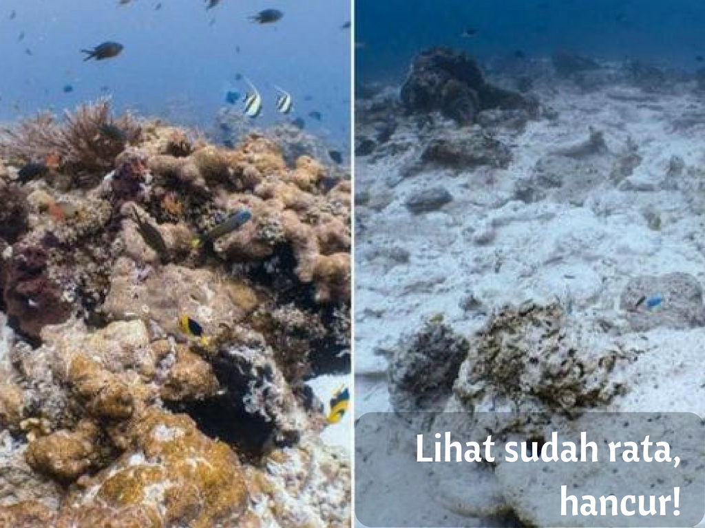 Hal ini harus ditindak dengan tegas. Wajar saja, dampak kerusakannya begitu parah. Keragaman 8 genus terumbu karang, diantaranya acropora, porites, montipora, dan stylophora, berkurang. Kalau perlu dituntut ke pengadilan agar mereka melakukan konservasi terumbu karang yang butuh waktu puluhan tahun itu.