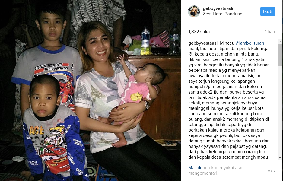 Namun hal tak senada disampaikan oleh seorang netizen dengan akun instagram @gebbyvestaasli, yang telah datang ke rumah 4 anak ini setelah pemberitaan viral di berbagai media. Dari informasi yang ia peroleh saat kesana banyak sekali bantuan yang datang, baik dari para pejabat maupun yayasan.