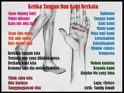 Dan pada waktu itu, yang mendapat giliran berbicara adalah tangan kita. Ia akan berbicara apa adanya tentang apa saja yang telah dilakukannya, apa saja yang pernah diambilnya dan dipegangnya. Lalu kaki kita, ia akan berbicara tentang kemana saja ia telah melangkah.