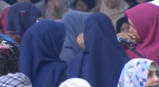 Mata Mahasiswi ini berkaca-kaca setelah pertanyaannya di jawab oleh Dr Zakir Naik, dengan tangis bahagia ia pun bersyahadat mengakui tidak ada Tuhan yang berhak disembah selain Allah Ta’ala dan mengakui bahwa Muhammad shalallahu ‘alaihi wasallam adalah Rasul-Nya.