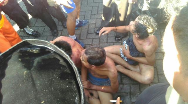 Dari foto yang tersebar di media sosial, tubuh para lelaki itu mnemar dan banyak bagian yang berdarah karena dihantam benda tumpul dan kayu. Mereka juga digunduli dan dipotong tak karuan oleh warga.
