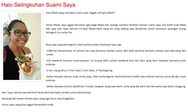 Anda bisa baca tulisannya di sini: 'Halo selingkuhan suami saya.'