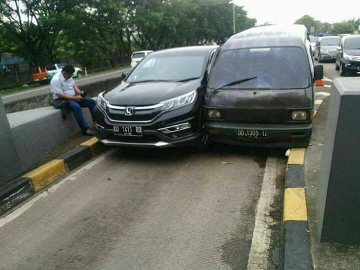 Sebuah foto 2 mobil yang saling menghimpit saat akan masuk pintu tol menjadi pembicaraan banyak orang. Banyak yang menghakimi dua mobil ini berebut masuk pintu tol. Padahal itu adalah berita hoax.