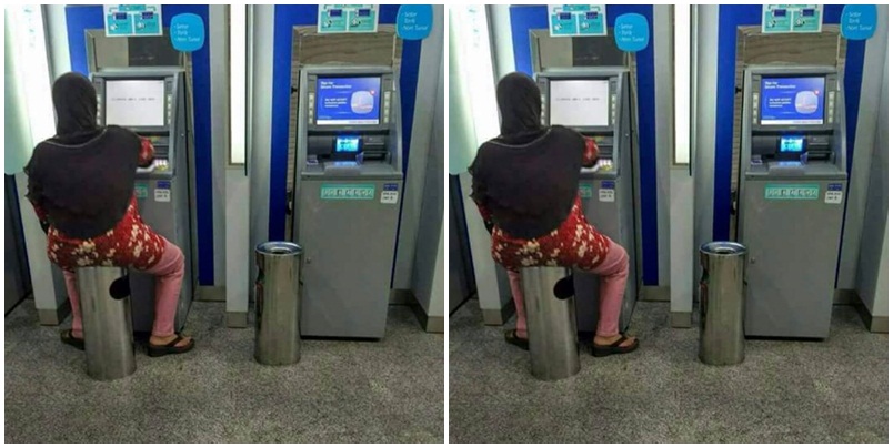 Lucunya, ibu itu menggunakan tempat sampah yang berada dalam ATM itu untuk duduk selama bertransaksi. Foto ini seketika menyedot perhatian netizen hingga di-retweet lebih dari 190 kali.