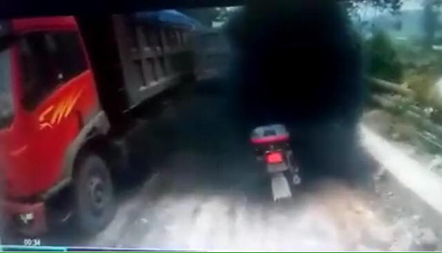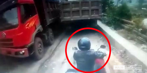 Tidak lama dari situ, sesuatu yang mengejutkan dialami pengendara motor. Sopir truk berwarna merah sepertinya tidak menyadari pergerakan pengendara motor.