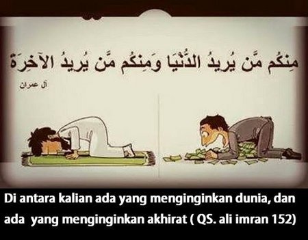 Penulis Unknown | Ditayangkan 11 May 2017Itulah dunia yang seseorang memang berat memikirnya, memang senang untuk dilakukannya dan ia rela meninggalkan suatu kewajiban hanya kepentingan dunia. Banyak orang yang terus menerus mengumpulkan harta benda demi kepentingan kekayaanya, tingkatan sosialnya, dan tingkatan kepuasannya. Mereka merasa sudah puas dan bahagia apa yang dilakukannya di bumi ini.