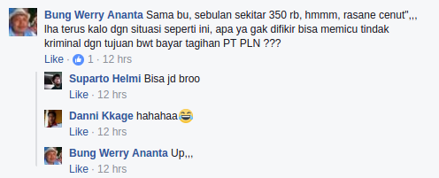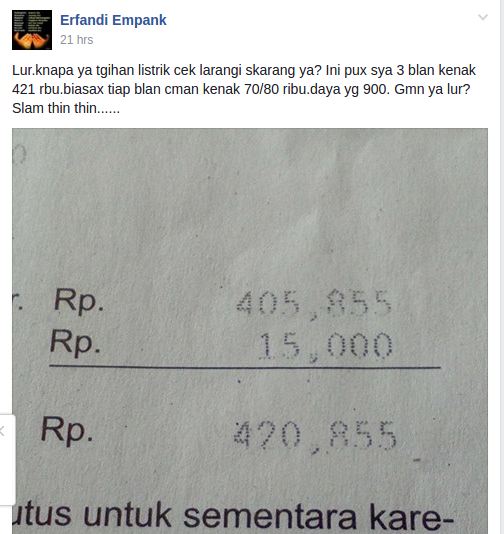 "Lur (Saudara)... knapa ya tgihan listrik cek larangi (mahal) skarang ya? Ini pux sya 3 blan kenak 421 rbu.biasax tiap blan cman kenak 70/80 ribu.daya yg 900. Gmn ya lur? Slam thin thin......" ujar akun Erfandi Empank