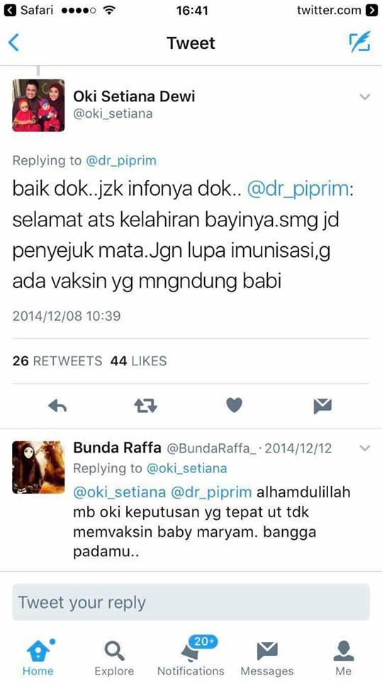 Pemain sinetron berhijab ini pernah me-reply postingan Dr Piprim dalam akun twitter miliknya pada 2014 lalu. Kabar kurang mengenakkan ini beredar di dunia maya sejak Oki memposting foto anaknya di twitter yang kemudian ditanggapi oleh Dr Piprim. Dalam postingan tersebut, Dr Piprim memberitahukan kalau tidak ada vaksin yang mengandung babi. Sedangkan netizen yang memiliki akun @BundaRaffa_ justru memuji keputusan Oki yang tidak memvaksin buah hatinya.