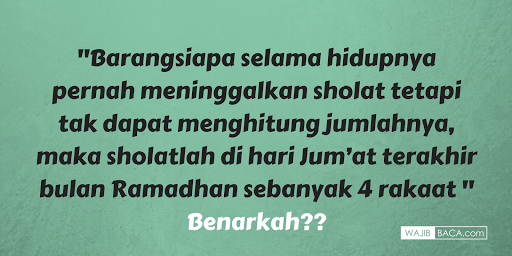 Bersabda Rasulullah SAW : ” Barangsiapa selama hidupnya pernah meninggalkan sholat tetapi tak dapat menghitung jumlahnya, maka sholatlah di hari Jum’at terakhir bulan Ramadhan sebanyak 4 rakaat dengan 1x tasyahud (tasyahud akhir saja), tiap rakaat membaca 1 kali Fatihah kemudian surat Al-Qadar 15 X dan surat Al-Kautsar 15 X .